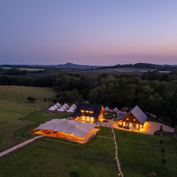 The log house accommodates 16 people, glamping tents 50 people. The total maximum capacity is 66 people.